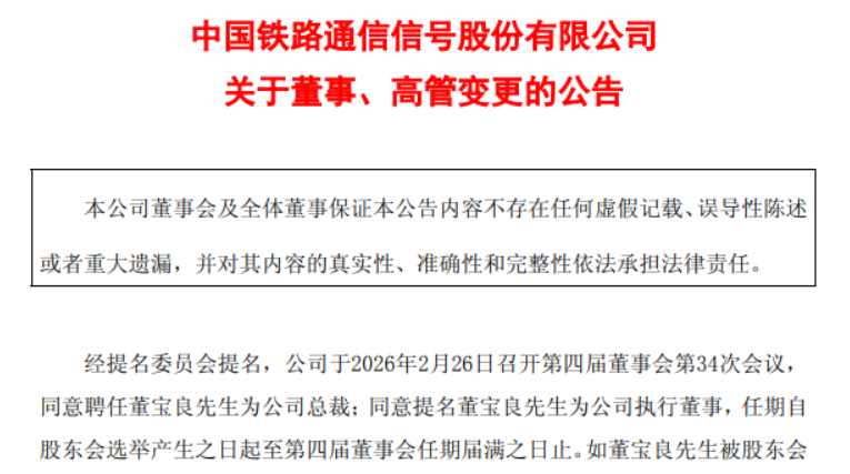 2026年2月27日,科创板上市公司中国通号(688009.SH)发布公告称,经提名委员会提名,公司董事会应许聘用董宝良为公司总裁;应许提名董宝良为公司实行董事,任期自激动会选举产生之日起至第四届董事会任期届满之日止。