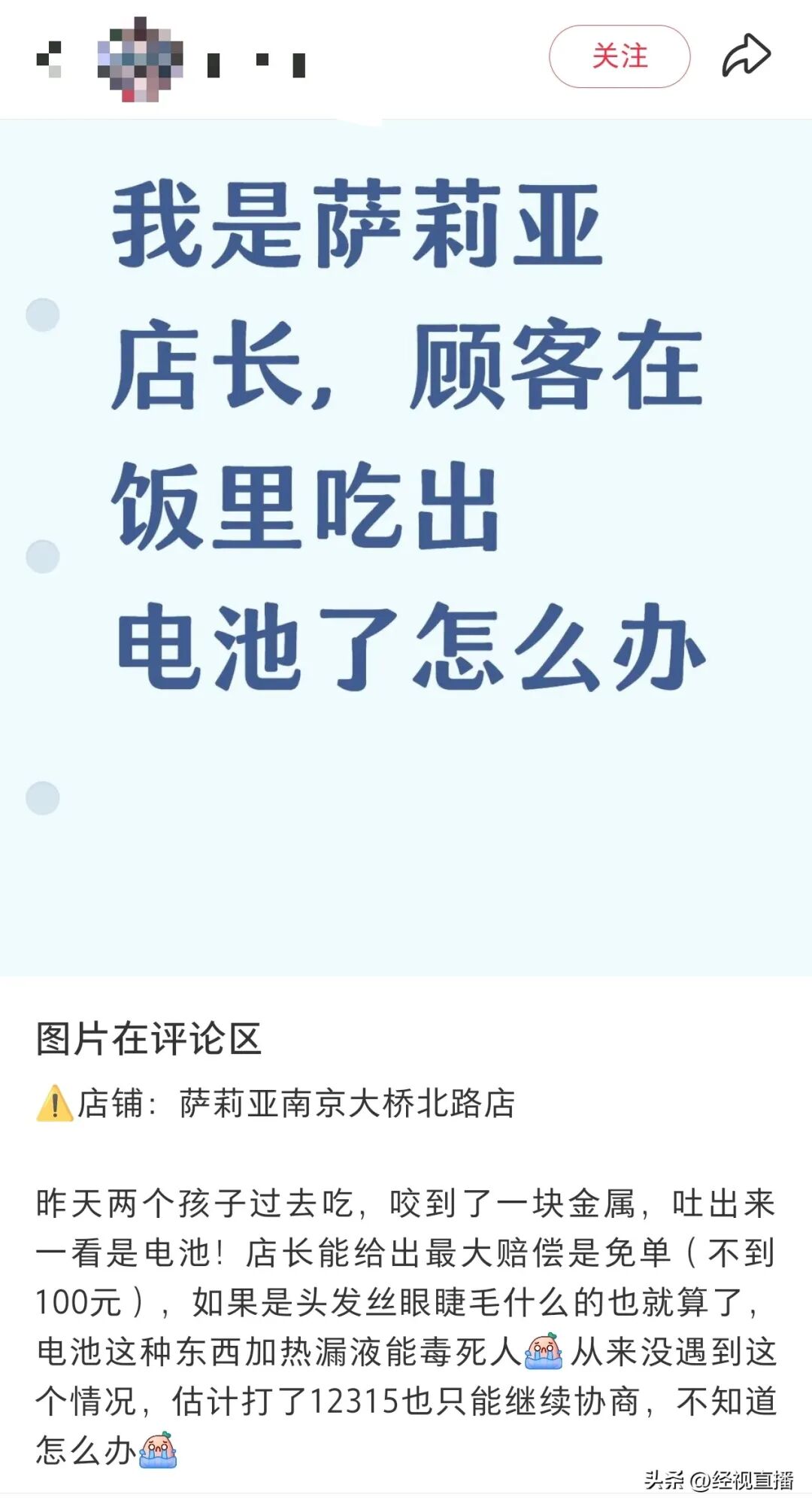 近日,有IP地址裸露为江苏的网友发帖称,家东谈主去萨莉亚意式餐厅南京弘阳广场店就餐时,从食品中吃出了一块金属异物,“吐出来一看是电板”。发帖者称,门店能给出的最大补偿是免单,一经拨打12315进行维权。