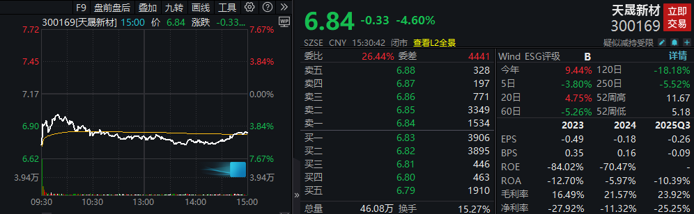 上周五盘后告示公司被证监会立案的天晟新材(维权)(300169)当天股价收跌4.60%。